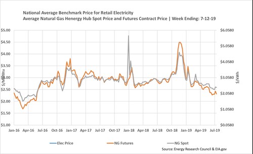 If natural gas production is expected to exceed demand, natural gas prices (and therefore power prices) are pressured downward. If demand looks like it will grow faster than natural gas production, prices trend upward. The basic scorecard the market uses to assess natural gas supply/demand is summarized in the accompanying graphs. Natural gas production has exceeded demand since the end of last winter. This has pressured natural gas prices downward to historic lows, reaching $2.16/MMBtu in late June. Since then, however, natural gas prices have begun to edge upward, ending last week (7/12/19) around $2.44/MMBtu.