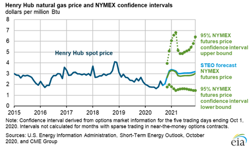 Rolled together with demand factors, natural gas and ultimately electricity prices can dramatically rise or fall as a result. As we inch closer to winter and drilling companies scale back due to financial pressures brought on by low oil prices, natural gas prices have started to rise dramatically. In fact, the U.S. Energy Information Administration expects natural gas spot pricing to average over 50% higher in 2021 than in 2020.