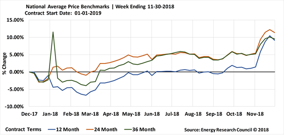 Backwardation creates an opportunity for organizations that may wish to examine renewal pricing for a contract that does not end for a year or two into the future. However, businesses that have contracts expiring in the near future, especially during the winter of 2018/2019 should also consider examining pricing options sooner rather than later. As prices are likely to remain volatile, it’s better to start monitoring that volatility early and lock-in during a period where prices decline, rather than run up against a contract’s expiration and have to settle for whatever the price is at the time, especially as short-term contracts are trending higher than long-term contracts in several states. Going on a month-to-month rate during the winter season is also not ideal, given the severe upward pricing risk presented by these market conditions.
